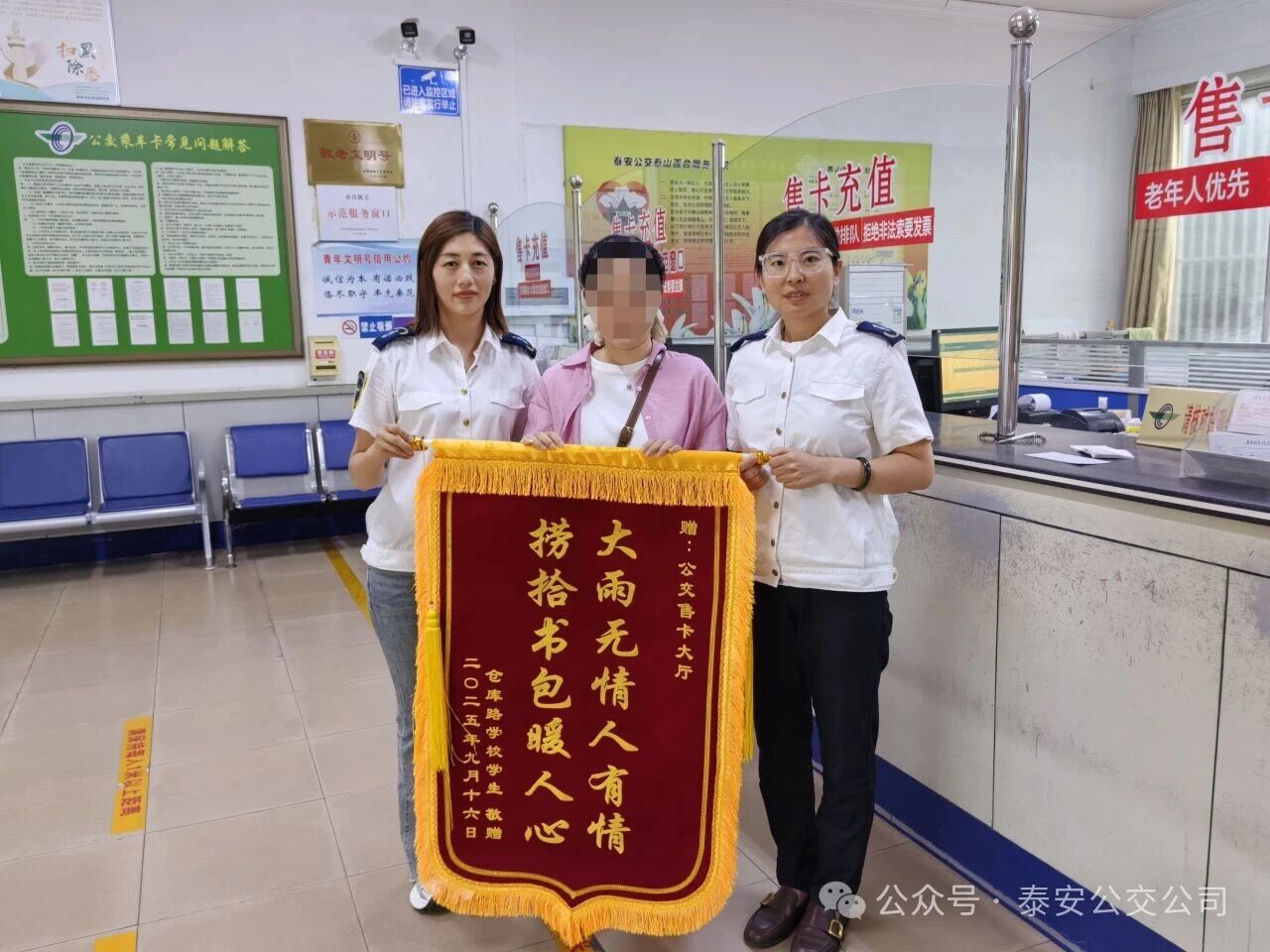 第二天下午,家長(cháng)特意帶著(zhù)一面錦旗來(lái)到泰山百合服務(wù)廳,贈予大廳工作人員,贊揚她們“大雨無(wú)情人有情 撈拾書(shū)包暖人心”的暖心行為。面對家長(cháng)的堅持,工作人員接過(guò)錦旗,心里涌起一陣溫暖——沒(méi)想到這小小的舉手之勞,能收獲家長(cháng)如此真摯的肯定。