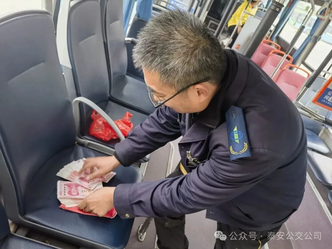 當天下午,駕駛員公鵬如往常一般,駕駛魯J08381D號公交車(chē)從山東第一醫科大學(xué)老校站出發(fā),駛向南高新區公交停車(chē)場(chǎng)。14時(shí)02分,車(chē)輛行至泰山火車(chē)站廣場(chǎng)站點(diǎn)時(shí),一名剛上車(chē)的乘客在后排座位發(fā)現一個(gè)不起眼的紅色塑料袋,打開(kāi)后竟看到一沓厚厚的百元現金。