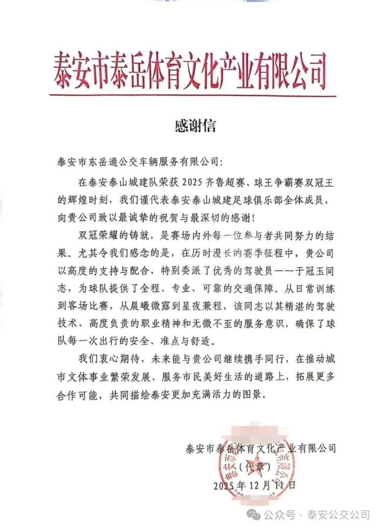 12月19日,泰安市泰岳體育文化產(chǎn)業(yè)有限公司向泰安公交東岳通公交車(chē)輛服務(wù)有限公司發(fā)出一封真摯的感謝信,對其在球隊奪冠征程中提供的堅實(shí)交通保障給予高度評價(jià),并特別對駕駛員于冠玉同志的專(zhuān)業(yè)服務(wù)與奉獻精神提出表?yè)P。